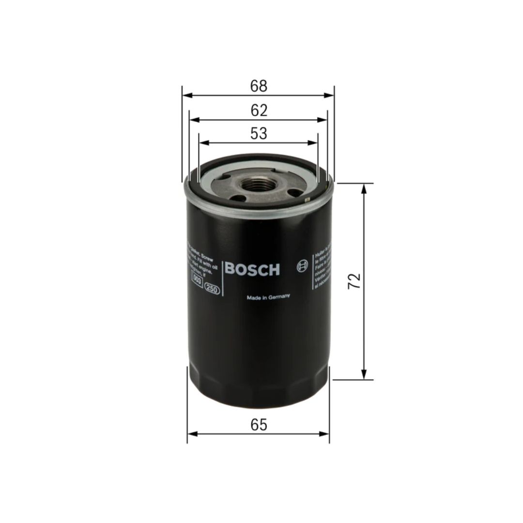 BOSCH Oil Filter Toyota - Suzuki - DaihatsuOuter Diamter 1 (mm) = 68Outer Diamter 2 (mm) = 65Height (mm) = 72Internal Diameter 1 (mm) = 62Internal Diameter 2 (mm) = 53Connecting Thread = 3/4" 16 UNF