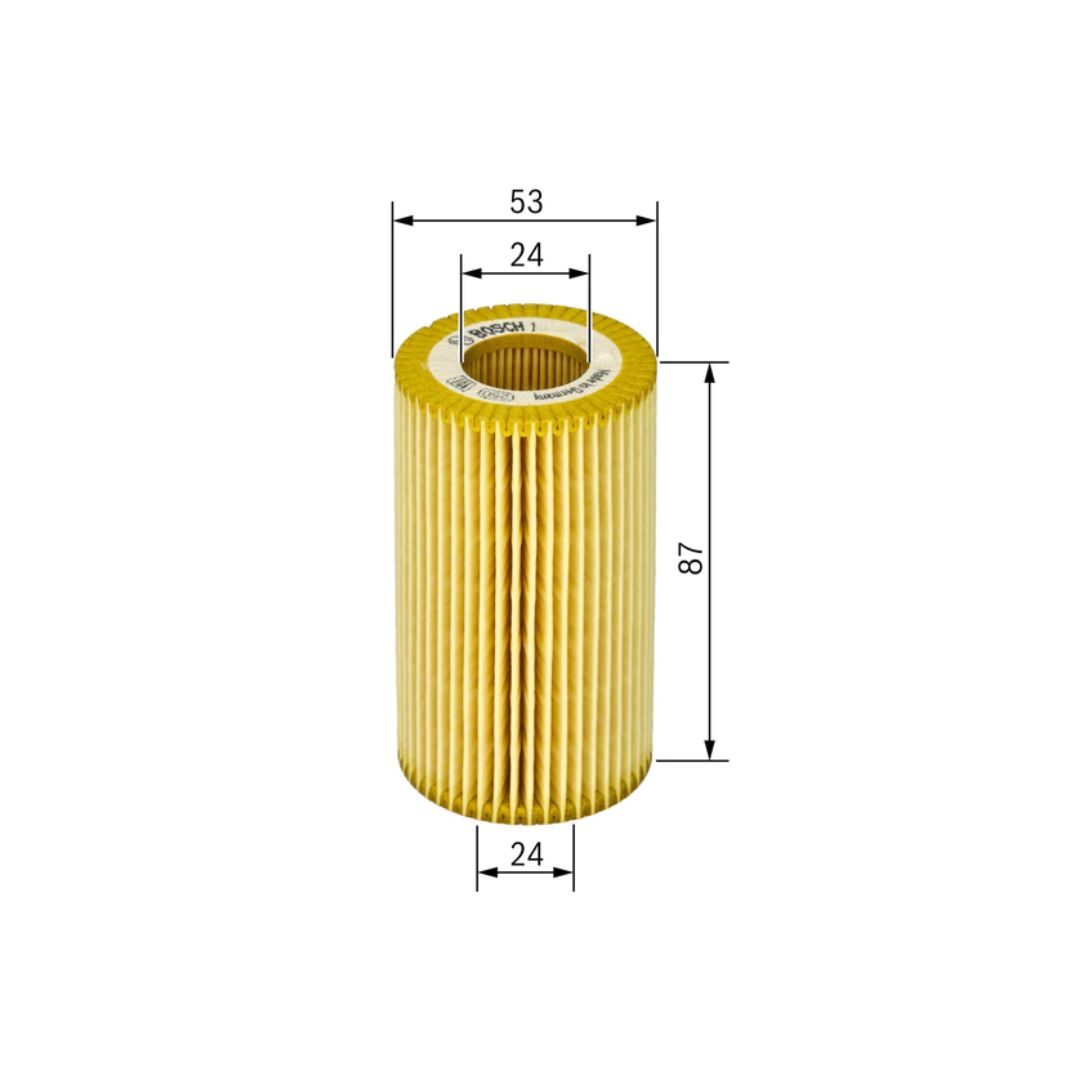 BOSCH Oil Filter Element Renault Clio 2Outer Diamter 1 (mm) = 53Height (mm) = 87Internal Diameter 1 (mm) = 24Internal Diameter 2 (mm) = 24